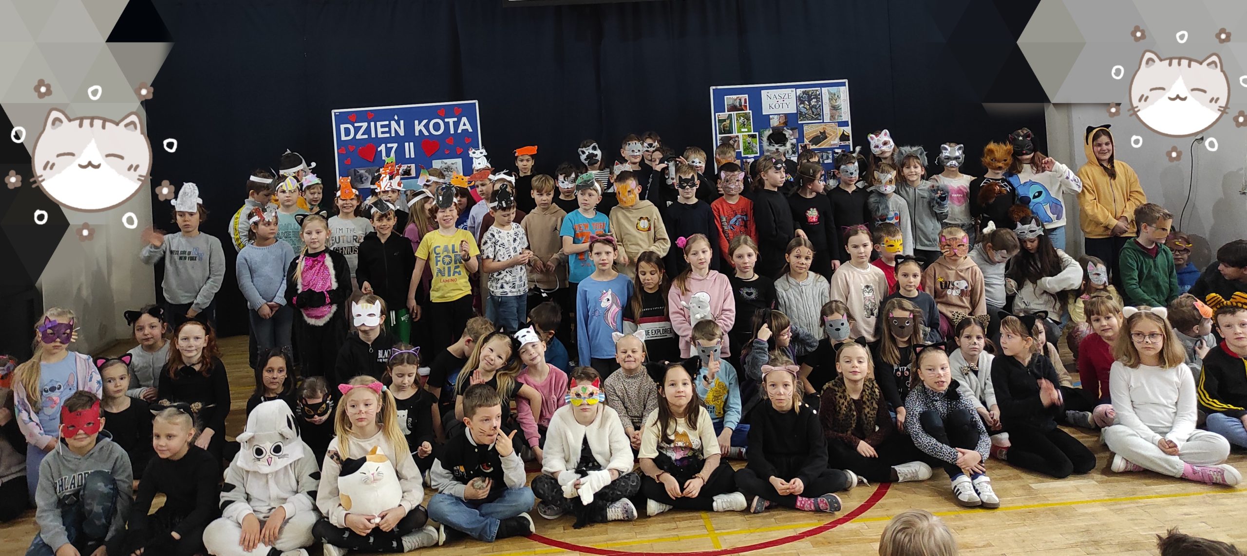 7 lutego 2025 obchodziliśmy w naszej szkole Dzień Kota. Uczniowie klas 1-3 przebrali się za te czworonogi. W trakcie zajęć poruszone zostały tematy odpowiedzialnej opieki nad zwierzętami domowymi oraz ich świadomej adopcji. Uczniowie wykonali maski kotów oraz nauczyli się wiersza Juliana Tuwima „Kotek”.Wszystkie „kociaki” spotkały się w sali gimnastycznej w celu podsumowania działań. Przedstawiciele klas wzięli udział w quizie o kotach. Na pamiątkę tego dnia zostało wykonane zdjęcie wszystkich „szkolnych kociaków”.
