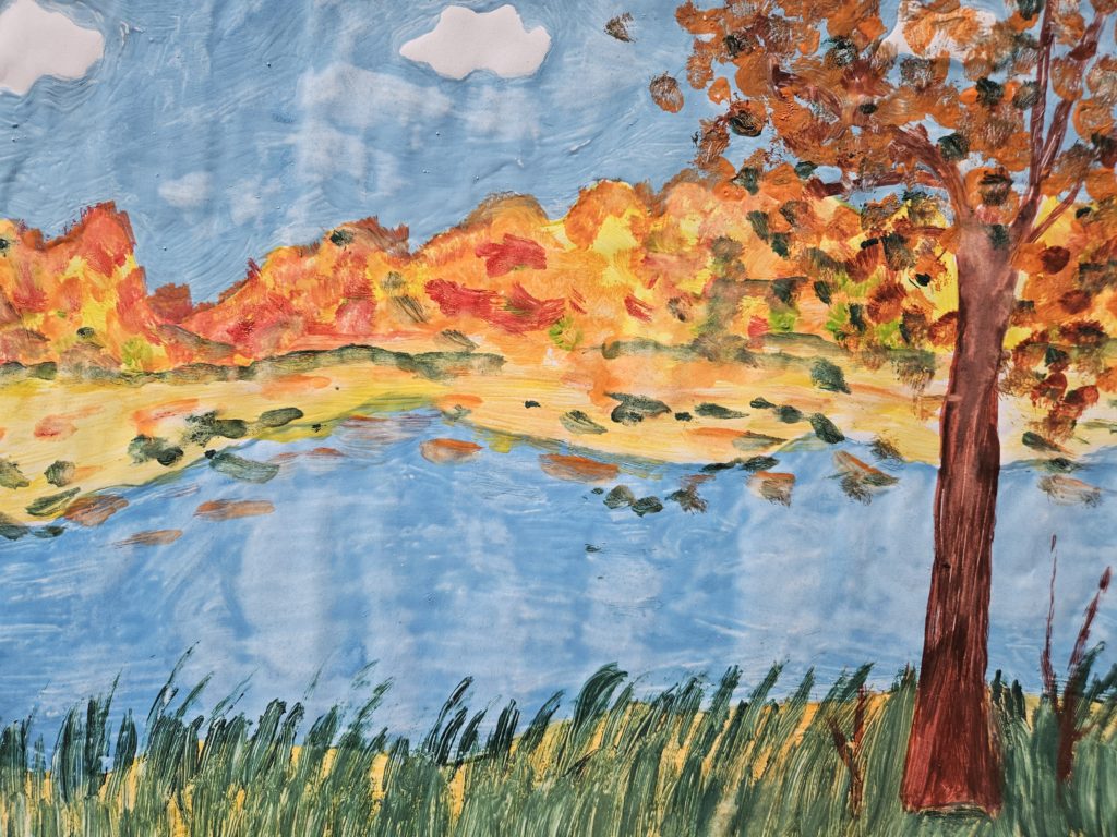 Polina Bondarenko kl. 5b. Na pierwszym planie, po prawej stronie duże drzewo z jesiennymi liśćmi. Na dole przez całą szerokość zielone trzciny. Na drugim planie niebieskie jezioro, za którym widoczne są żółty plan polan. Na linii horyzontu wysokie, żółtawe góry.Plastyka klas 4 i 5. Gama barwna. Miękka plama malarska.