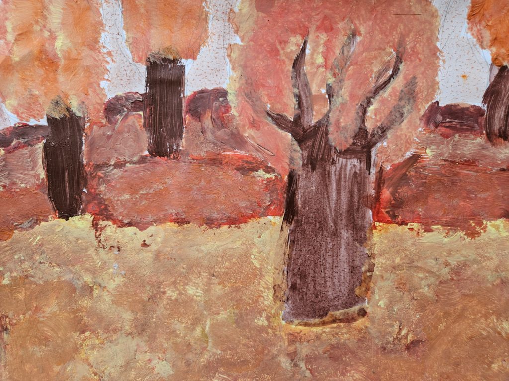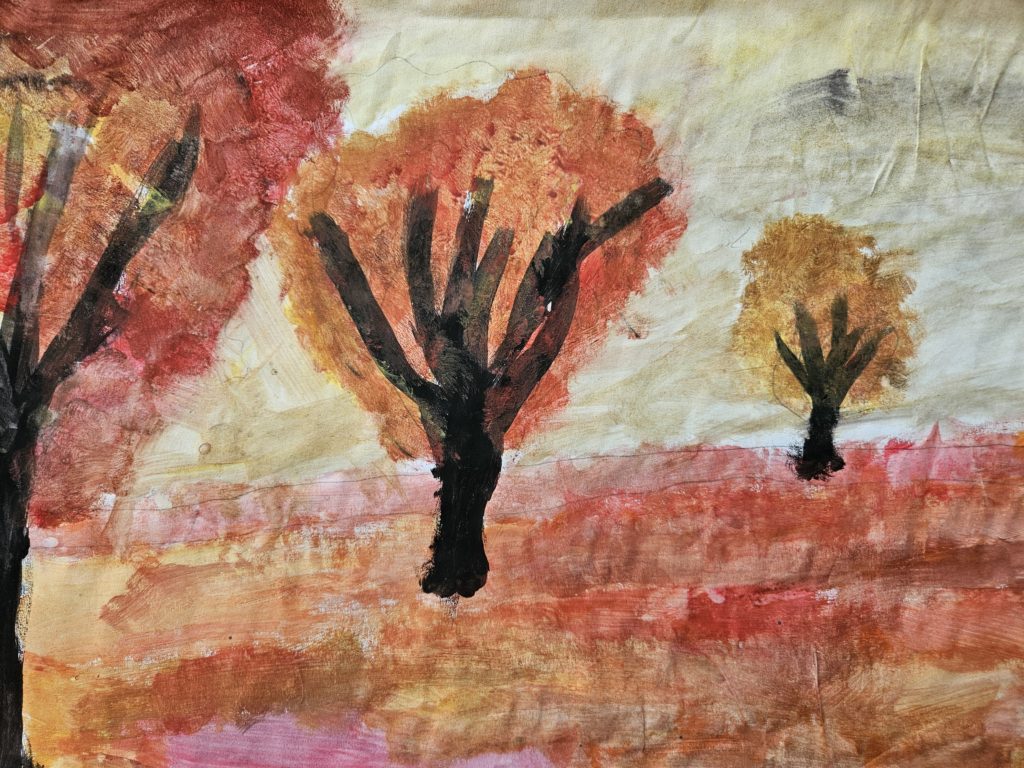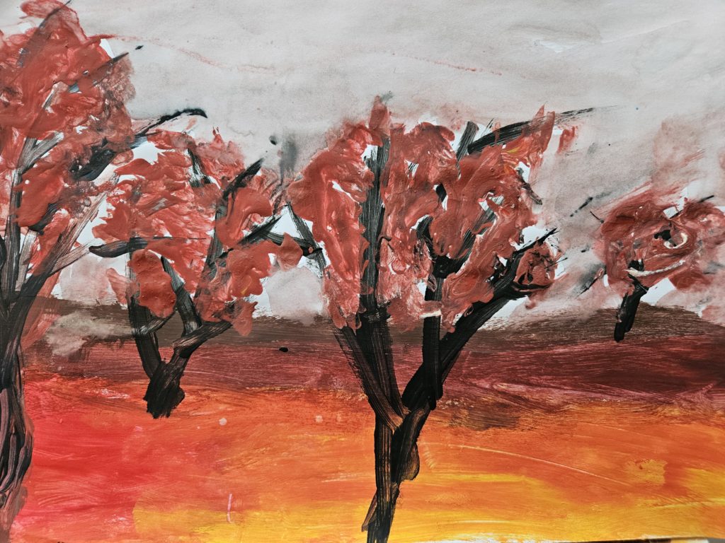 Anna Marek kl. 5c. Na pierwszym planie, po bokach dwa duże drzewa, na środku zarys krzaczka. Dalsze plany mniej intensywne barwy - schładzane. Na niebie trzy duże obłoki. Całość w wyciszonej ciepłej gamie barwnej. Polina Bondarenko kl. 5b. Na pierwszym planie, po prawej stronie duże drzewo z jesiennymi liśćmi. Na dole przez całą szerokość zielone trzciny. Na drugim planie niebieskie jezioro, za którym widoczne są żółty plan polan. Na linii horyzontu wysokie, żółtawe góry. Ignacy Michno kl. 4b. Ziemia podzielona jest na trzy plany. Na każdym planie widoczne ciemne bryły zmniejszających się drzew. Całość w ciepłej gamie barwnej. Oliwia Zatorska kl. 5a. Cały krajobraz podzielony jest na trzy zwężające się plany. W planach umieszczone są zmniejszające się ku linii horyzontu drzewa. Całość w ciepłej gamie barwnej. Marta Szóstakowska kl. 4b. Całość krajobrazu podzielona jest na trzy plany. W planach wmalowane są trzy zmniejszające się w oddali drzewa. Całość w ciepłej gamie barwnej