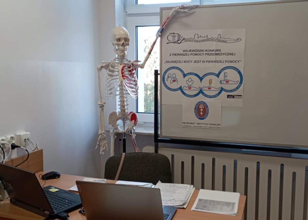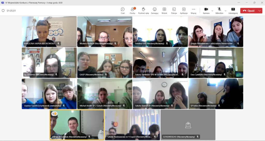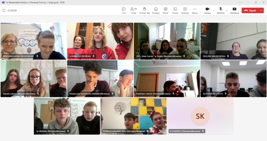 Na pierwszym planie biurko z dwoma otwartymi laptopami i rozłożonymi dokumentami. W tle tablica z plakatem Wojewódzkiego Konkursu z Pierwszej Pomocy, ilustracją łańcucha przeżycia oraz logiem GUMed. Obok stoi model ludzkiego szkieletu. Na jasnym tle okna aplikacji Teams widok z 11 kamer. W każdym okienku przed komputerem siedzi drużyna składająca się trzech zawodników. W lewym górnym rogu organizatorki konkursu na tle plakatu „NAJWIECEJ POMOCY JEST W PIERWSZEJ POMOCY”. Na jasnym tle okna aplikacji Teams widok z 14 kamer. W każdym okienku przed komputerem siedzi drużyna składająca się trzech zawodników. W lewym górnym rogu organizatorki konkursu na tle plakatu „NAJWIECEJ POMOCY JEST W PIERWSZEJ POMOCY”. Na jasnym tle okna aplikacji Teams widok z 15 kamer. W każdym okienku przed komputerem siedzi drużyna składająca się trzech zawodników. W lewym górnym rogu organizatorka konkursu na tle plakatu „NAJWIECEJ POMOCY JEST W PIERWSZEJ POMOCY”.