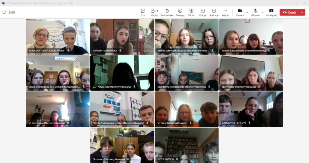 Na jasnym tle okna aplikacji Teams widok z 11 kamer. W każdym okienku przed komputerem siedzi drużyna składająca się trzech zawodników. W lewym górnym rogu organizatorki konkursu na tle plakatu „NAJWIECEJ POMOCY JEST W PIERWSZEJ POMOCY”.Drugi etap IV Wojewódzkiego Konkursu z PP za nami. W konkursie wzięło udział 40 drużyny z województwa pomorskiego. W wyniku przeprowadzonych eliminacji do finału konkursu przechodzą drużyny z najwyższą punktacją z Quizu: