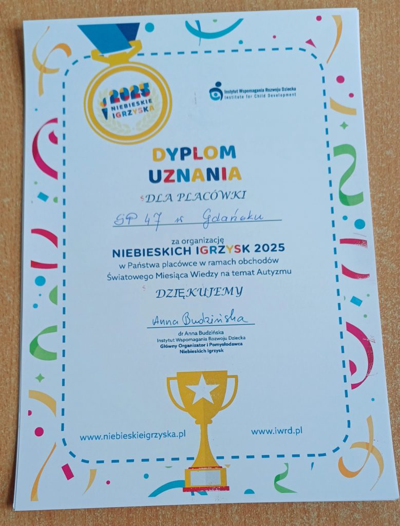 Niebieskie Igrzyska 2025 Opublikowany 15 kwietnia 2025 przez Alicja Ratajczak Dyplom uznania za organizację Niebieskich Igrzysk 2025.