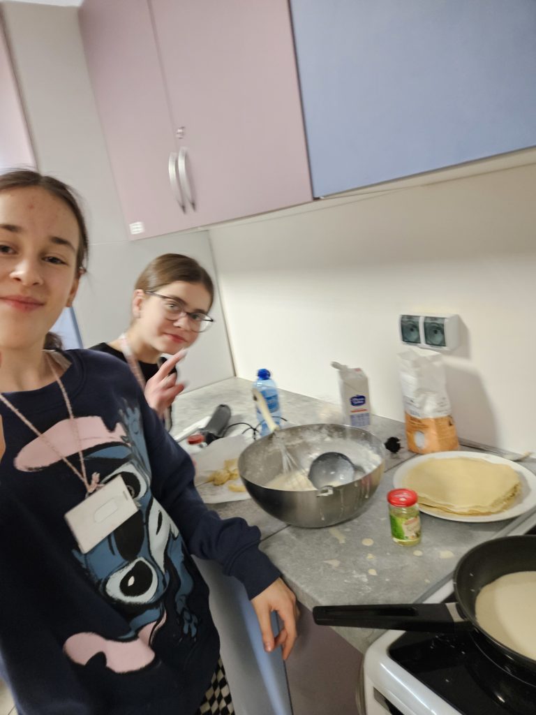 Na pierwszym planie chłopcy mieszający ciasto na naleśniki w dużych miskachPieczemy babeczki, placuszki i smażymy naleśniki na zajęciach kółka artystyczno-technicznego.