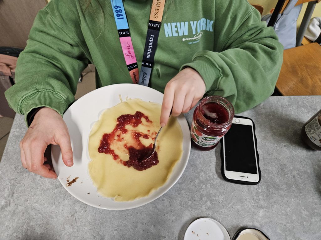 Na stole leżą produkty do pieczenia oraz miseczki. Trzy dziewczynki przygotowują ciasto w miseczkach Na pierwszym planie wypiekacz do placuszków. Za nim na stole ustawione gofrownice Na zdjęciu upieczone, czekoladowe babeczki Na pierwszym planie miski z ciastem i dziewczynki, które przygotowują się do smażenia naleśników Na pierwszym planie chłopcy mieszający ciasto na naleśniki w dużych miskach Na stole widać talerz z naleśnikiem, w trakcie smarowania dżemem
